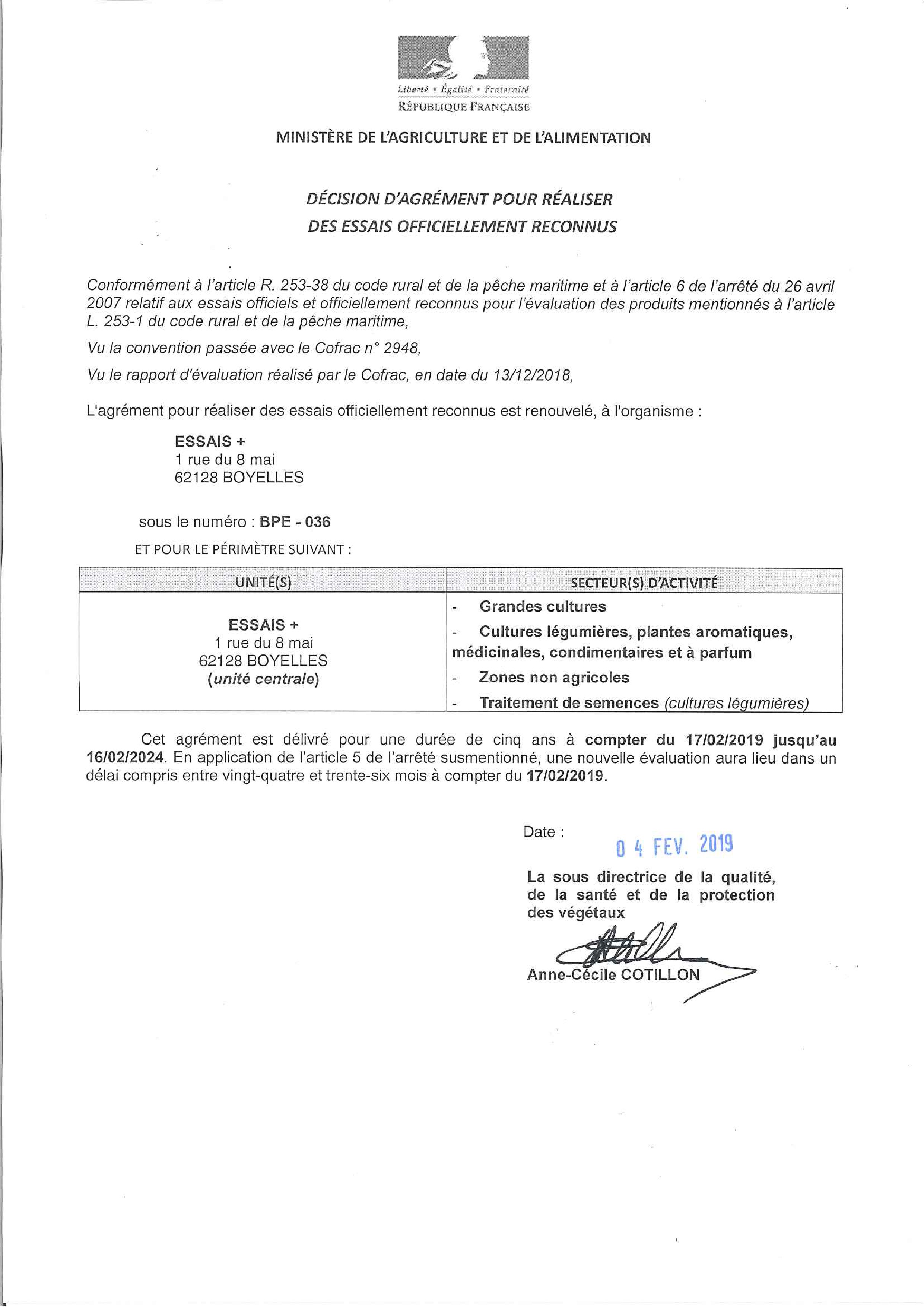 Agréée BPE depuis 1997, Essais+ est officiellement reconnue pour générer des données relatives à l'efficacité des produits phytopharmaceutiques, dans le cadre du processus de leur mise sur le marché.